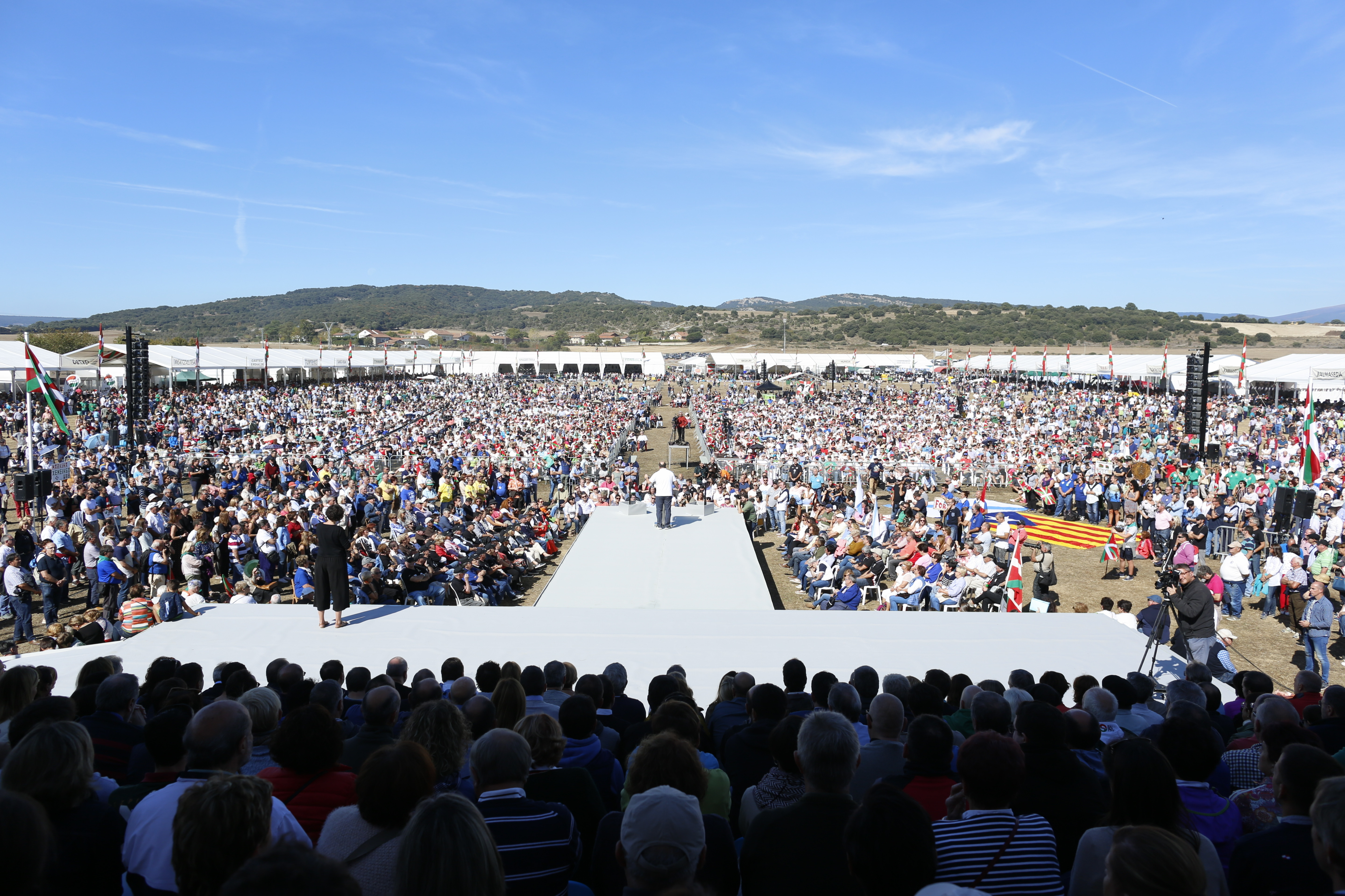 “Gobernatzea adierazpenak egitea baino askoz gehiago da. Gauzak egitea da, konpromisoak betetzea, arazoak adore osoz onartzea. Eta hori da, hain zuzen, Euskadirentzat eskatzen duguna: hartutako konpromisoak behingoz bete ditzatela. Denborak aurrera darrai eta pazientzia gero eta txikiagoa da”. Hitz horiek esan nahi dizkio Euzkadi Buru Batzarreko presidente Andoni Ortuzarrek Pedro Sánchez Espainiako Gobernuko presidenteari, Alderdi Egunean, EAJ-PNVk Forondako zelaietan ‘Prest!’ goiburupean milaka alderdikide eta alderdizale jeltzalerekin batera ospatu duen honetan. Iñigo Urkullu Lehendakariak EAJ-PNV osatzen duten emakume eta gizon guztien ahalegina hitzeman du. “Euskal autogobernua eguneratzeko eta sakontzeko akordioa are zabalago egiteko”, lan horri “ batzuen maximalismoei eta besteen manikeismo eta gelditasunei aurre eginez” egin beharko zaiolarik. “Ekin egingo diogu”, bermatu du Urkulluk. Eszenatoki ondoan jarri duten lazo hori erraldoi batekin gogoratu dituzte espetxean edo erbestean dauden Kataluniako politikariak. Horietako batzuk behin baino gehiagotan egon dira Alderdi Egunean, eta Ortuzarrek eta Urkulluk gaurkoan ere exijitu dute berehala askatuak izan daitezela. Gainera, EAJren ekitaldi nagusian izan dira Europa, Amerika eta Afrikako 13 naziotako 16 talde politikotako ordezkariak.